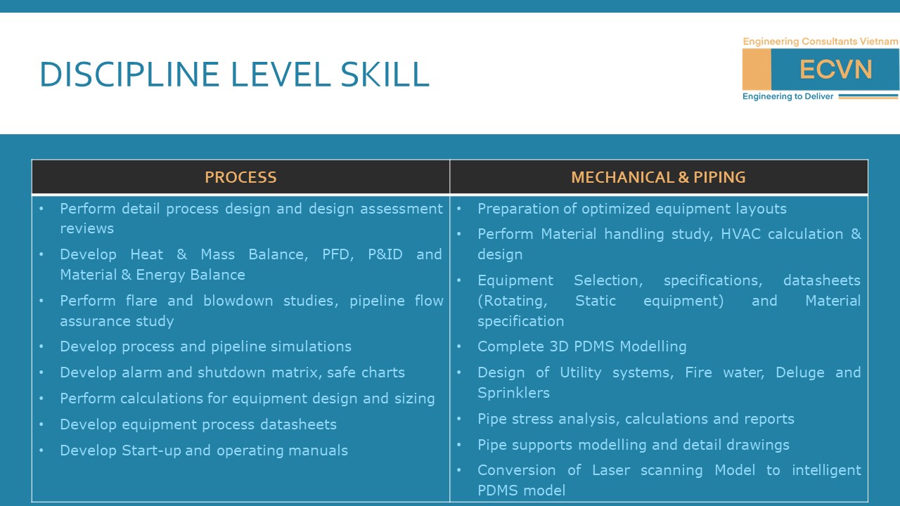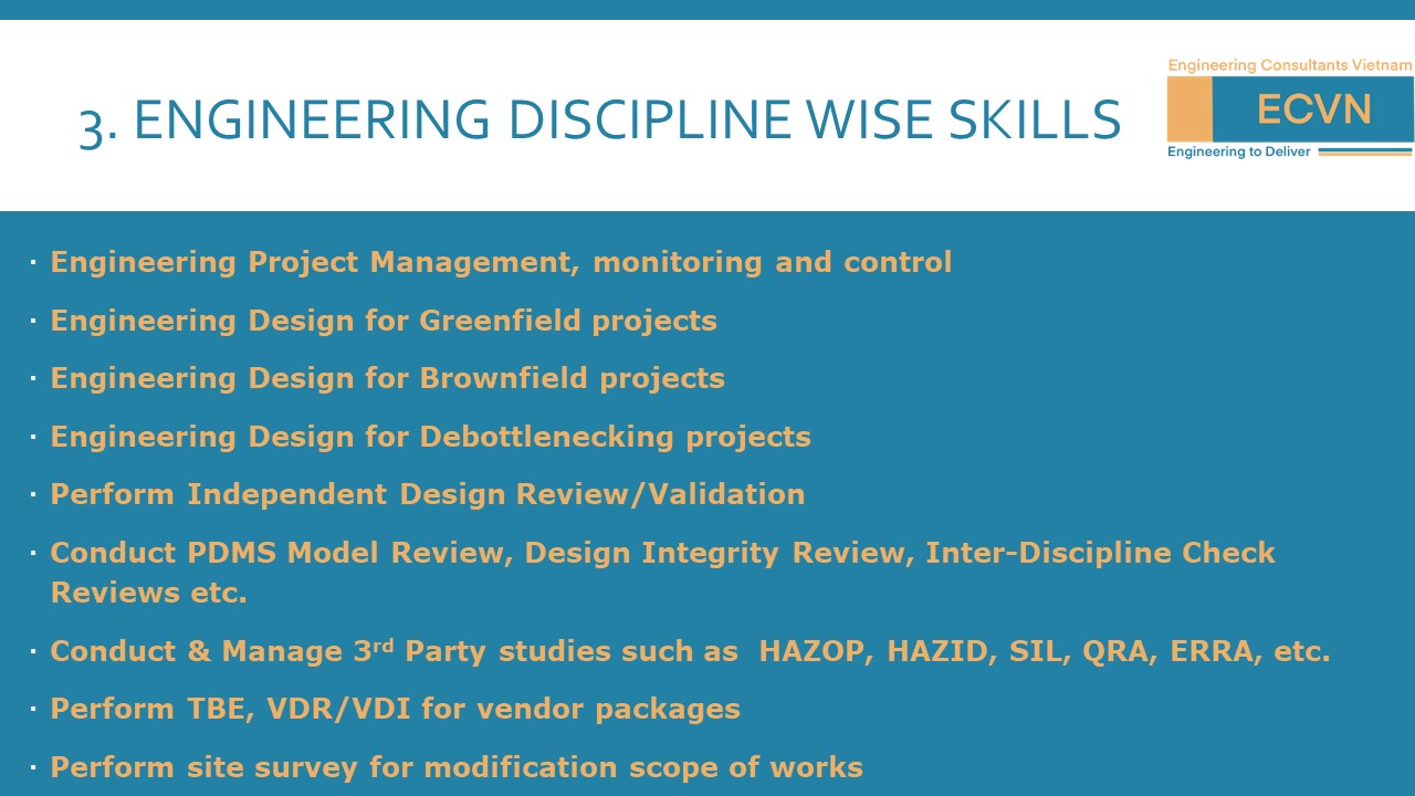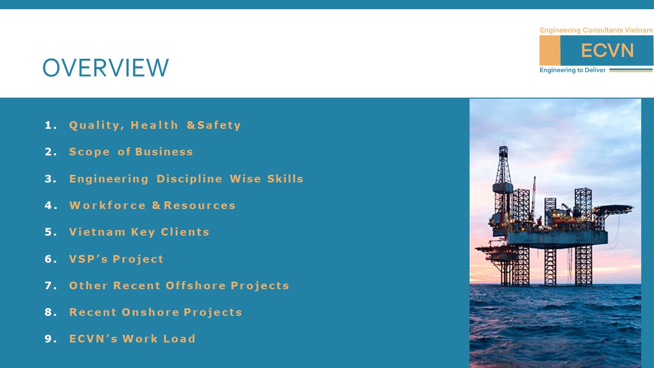 ECVN is a multidisciplinary engineering and project management consulting organization based in Ho Chi Minh City, Vietnam, that supports diverse client needs in energy sector (oil & gas and renewables), as well as industrial projects in Vietnam and Asia Pacific region. Our experts have over 30 years of experience in delivering feasibility studies, front-end engineering design, detail engineering, procurement support services and project management consulting in offshore/onshore oil & gas sector, renewables (wind), LNG plants & terminals, as well as downstream chemical and industrial projects.